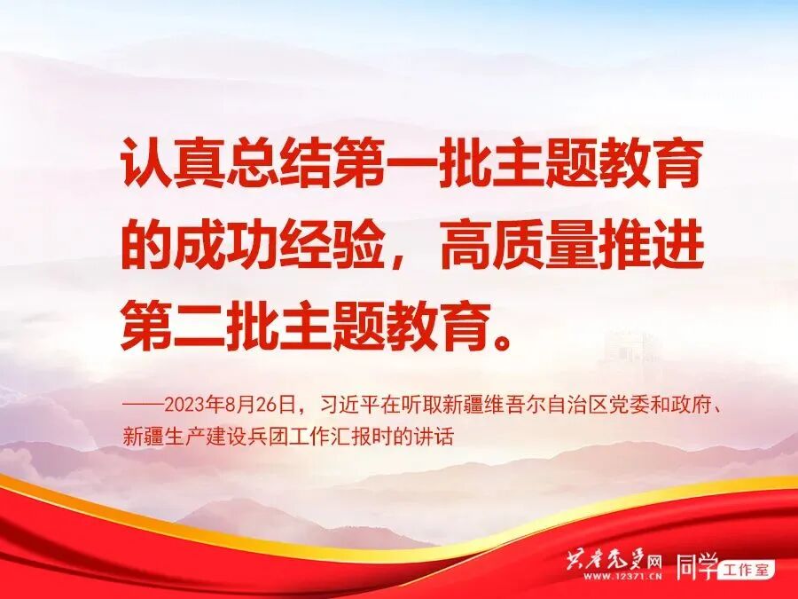 2023年8月26日,习近平在听取新疆维吾尔自治区党委和政府、新疆生产建设兵团工作汇报时强调,认真总结第一批主题教育的成功经验,高质量推进第二批主题教育,结合新疆实际加强干部队伍理论学习和政策培训,提高各级领导干部调查研究、把握政策、推进工作、联系群众的能力。