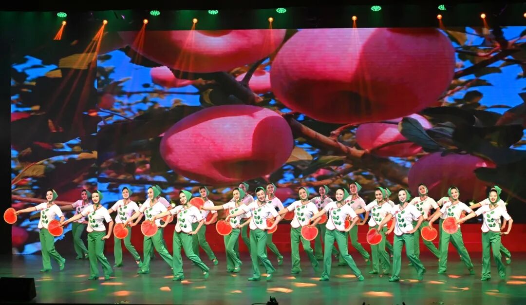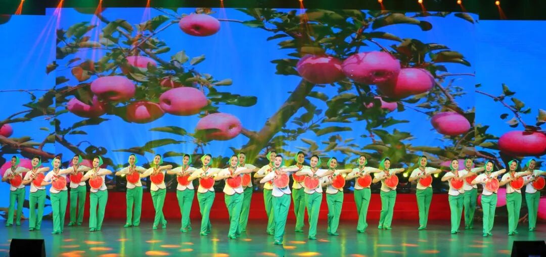 舞蹈《苹果红了》由退休干部、山东民间舞专家张荫松(原烟台市群众艺术馆馆长)创作,其创作灵感来源于烟台真实的乡村生活。烟台作为中国现代苹果的发源地,苹果不仅是经济产业,更深深融入了当地文化。舞蹈中每一个动作都凝聚着创作者对乡村劳动生活的细致观察和艺术提炼。舞蹈编排上巧妙融入了海阳大秧歌“颠步”“摆臂”等特色元素。舞者们手持红色蒲扇,踏着欢快的节奏,用质朴生动的舞蹈语言讲述着苹果丰收的故事,生动勾勒出青山绿水间果乡人喜摘硕果的美好图景。